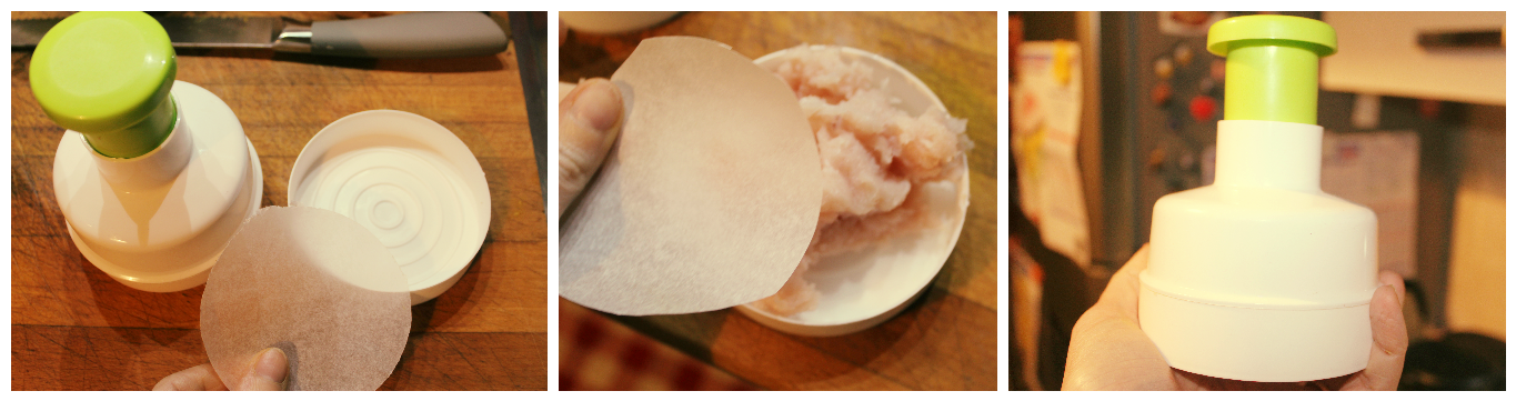 Inserito un dischetto di carta forno sulla base della pressa poi la polpetta di carne è un altro dischetto di carta forno sopra chiudete la pressa e schiacciate aprite e avrete ottenuto il vostro primo hamburger.