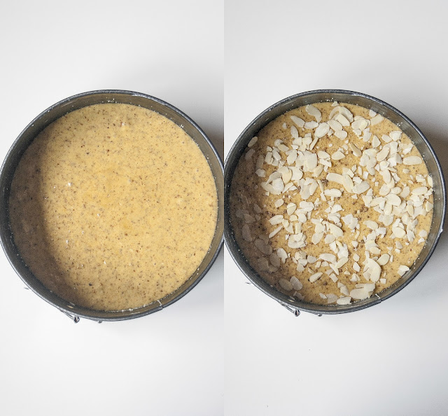 A questo punto versate il tutto nello stampo a cerniera apribile foderato con la carta forno (oppure oliato e infarinato), livellate e aggiungete in superficie una manciata di zucchero di canna e alcune mandorle a lamelle.