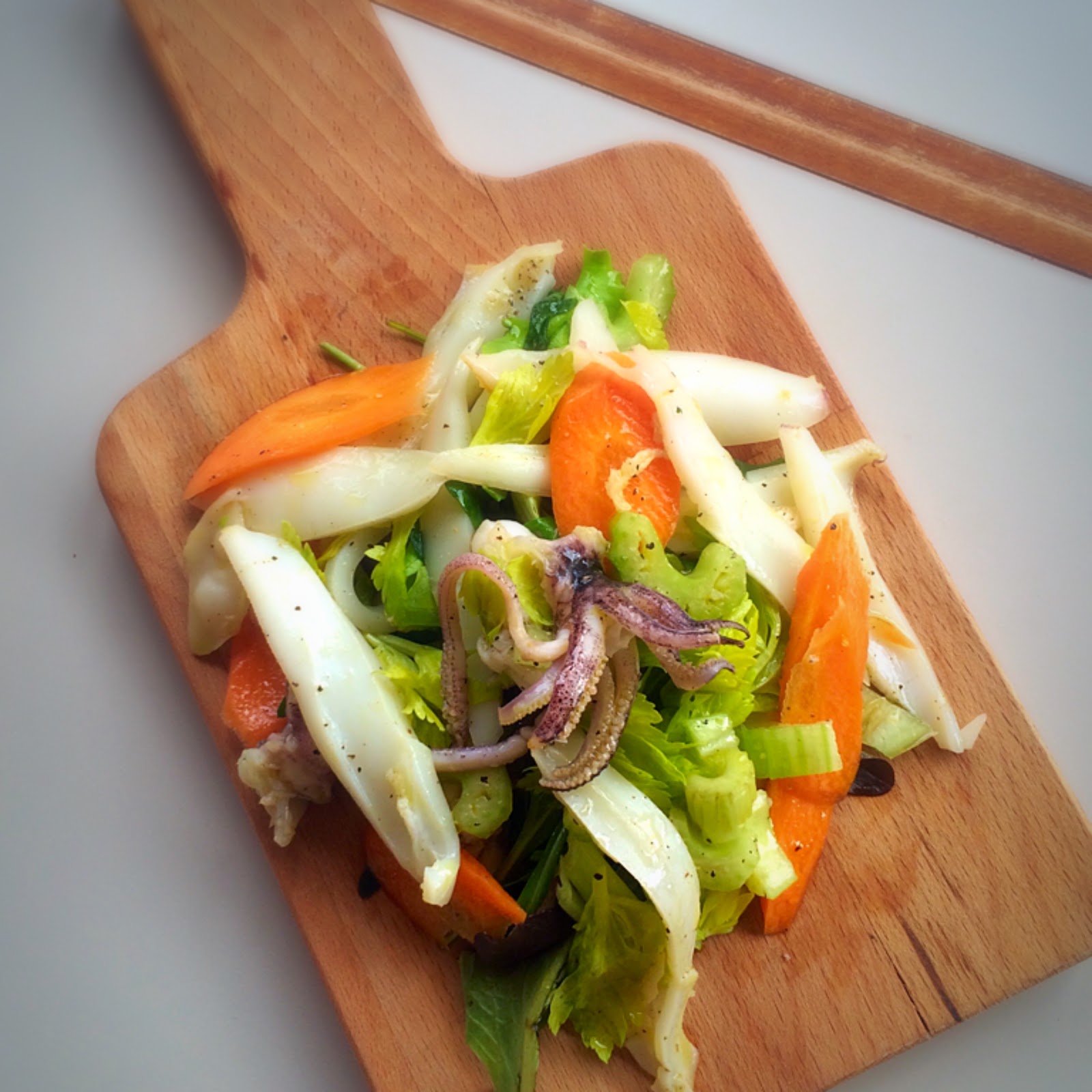 Tagliate i calamari listarelle, il sedano ad archetto e le carote. Mettete il tutto dentro una bol e condite con sale olio e pepe nero.