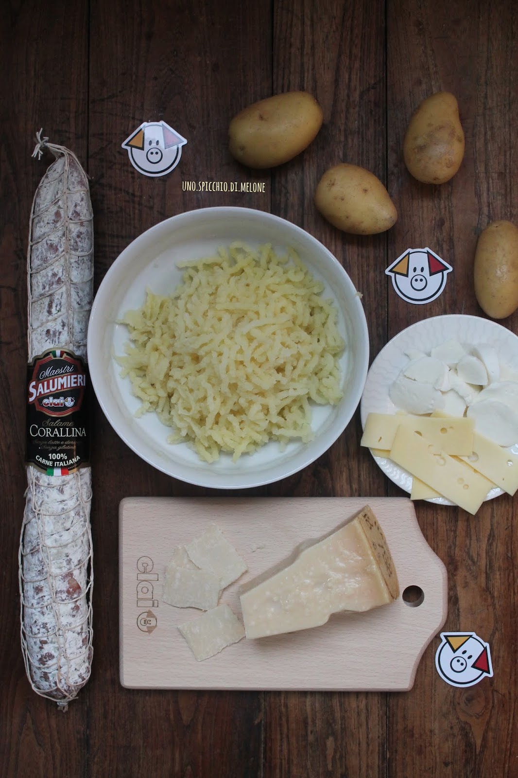 Con l’aiuto di un cucchiaio schiacciate bene la purea di patate sulla teglia; aggiungete i formaggi tagliati a fette/dadi e le fette sottili di SALAME CORALLINA CLAI SALUMI.