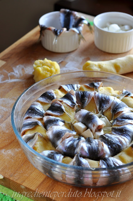 Rivestita la teglia tutto intorno con una fila di sarde, la parte esterna deve essere rivolta verso il contenitore, posizionate una parte del rotolo di patate e ripiegate sopra le sarde; continuate con un altro giro di sarde e poi rotolo di patate, al centro mettete qualche sarda e la mozzarella a dadini.