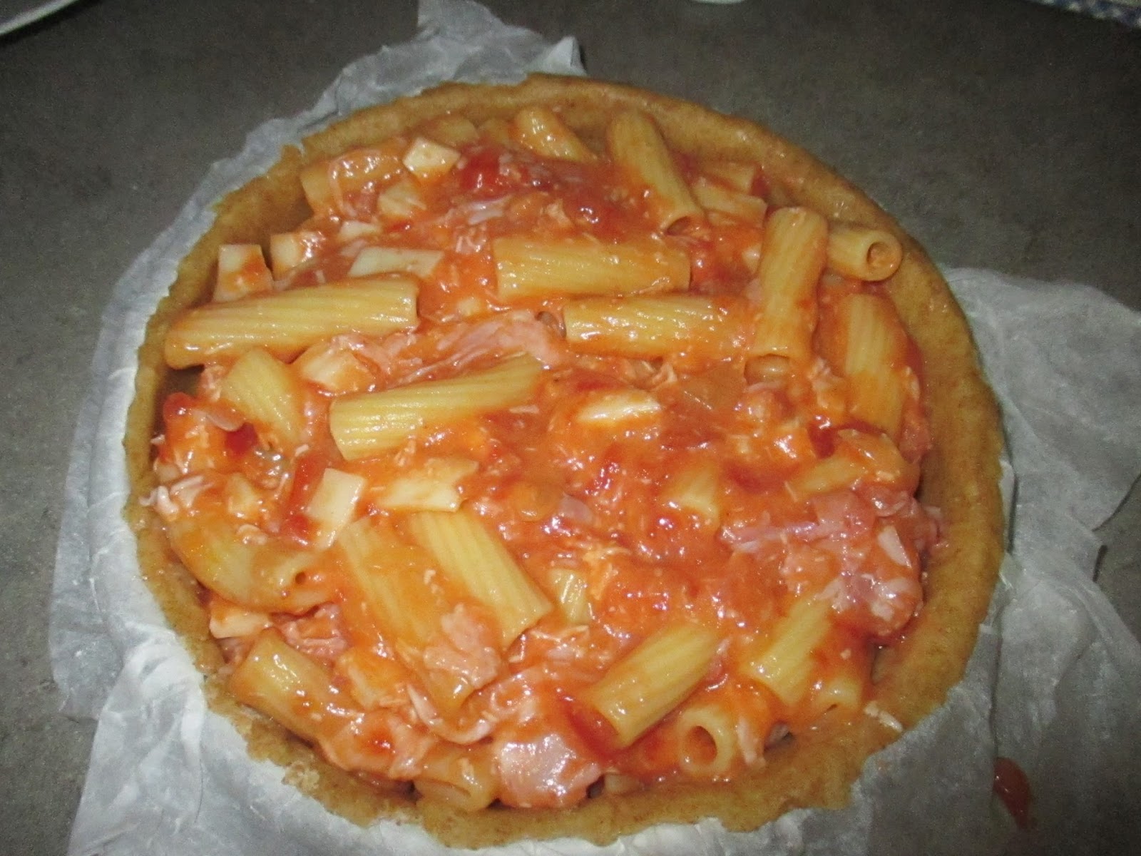 Take the dough for the shell, pull on a pastry, then prelevatene 2/3 for base and lasciatene 1/3 for coverage. Place the base into the pan, then cook in a pot of hot water the macaroni. Drain them, stops the cooking with cold water, then put them in a bowl with the béchamel, eggplant, prosciutto and mozzarella. Add Parmesan cheese and bread crumbs then turn well and transferred to the filling inside the cake pan.