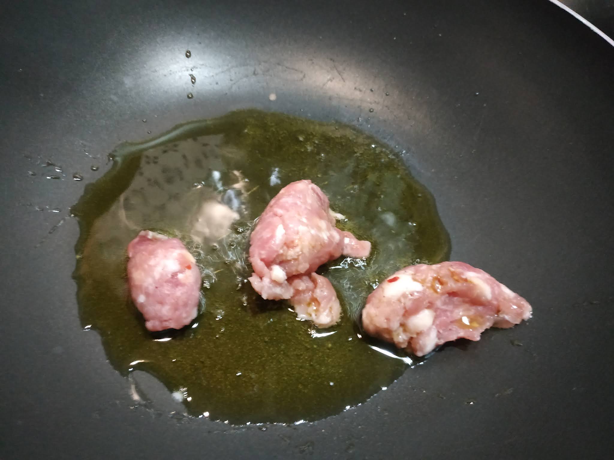 Intanto che l’acqua bolle per la cottura della pasta, fate rosolare in padella la salsiccia con l’olio.