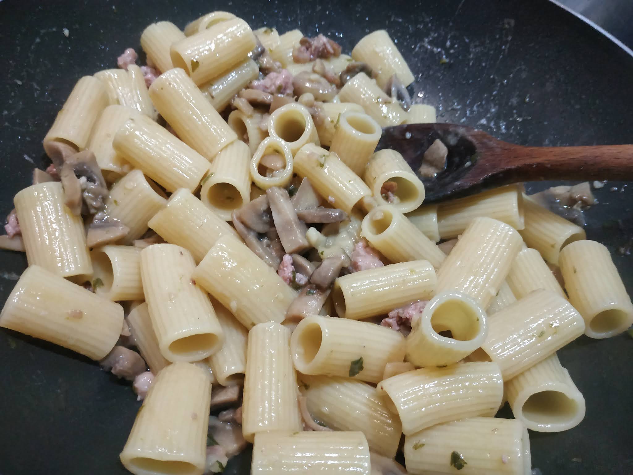 Ingredienti: 350 g di rigatoni, 100 g di castagne bollite e ripulite della pellicina, 100 g di salsiccia privata del budello, 100 g di funghi trifolati (i miei erano champignon, ma potete scegliere i vostri preferiti), 2/3 pomodorini tagliati a cubetti, prezzemolo, olio extravergine d’oliva, vino bianco.