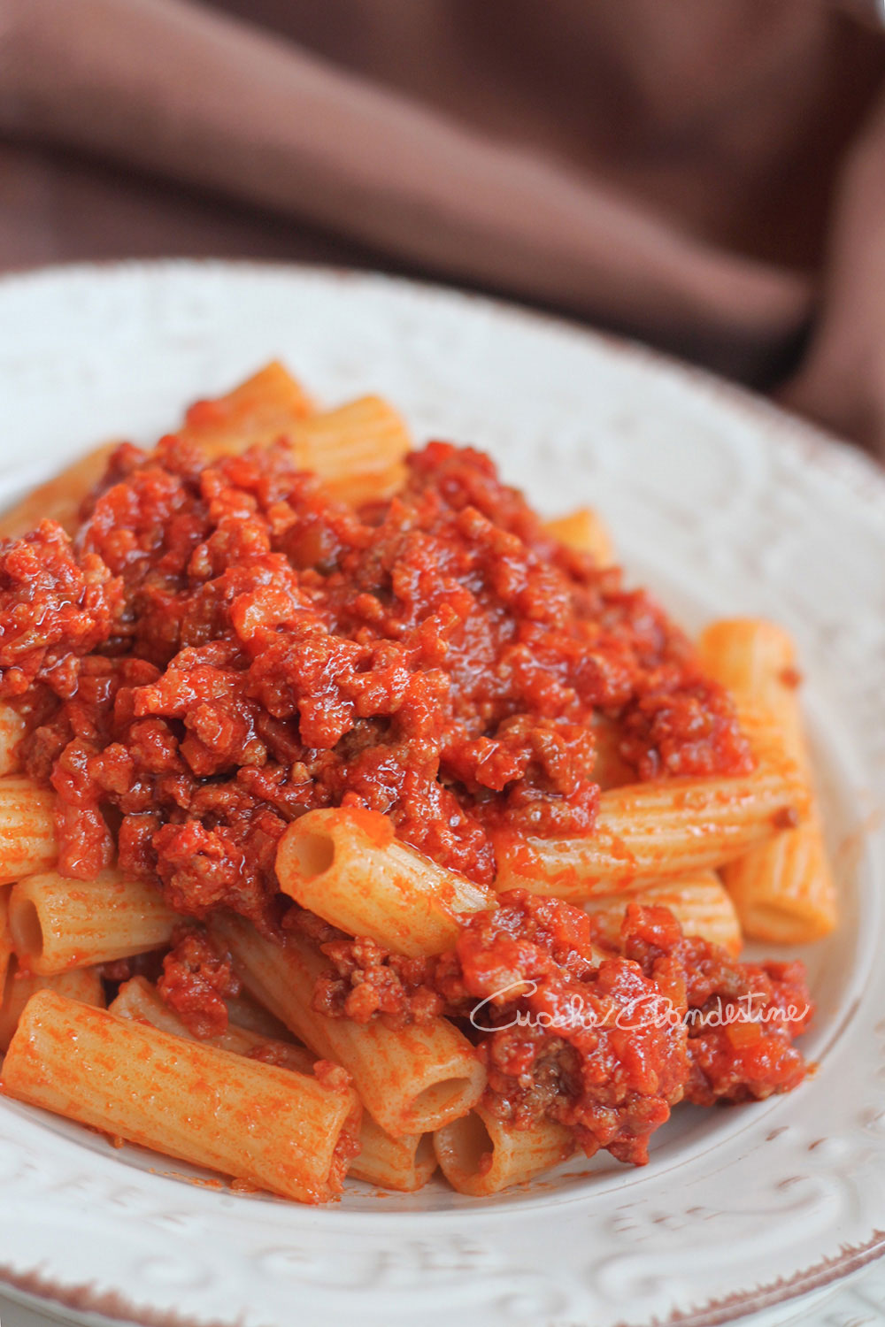 Si ustedes leen el post publicado recientemente, de acuerdo con la Academia de cocina italiana con la salsa boloñesa no (NO) se condimentas los fideos co tallarines. La salsa se utiliza para lasaña, ñoquis o pasta. Así que aquí están nuestros rigatonis con ragù.