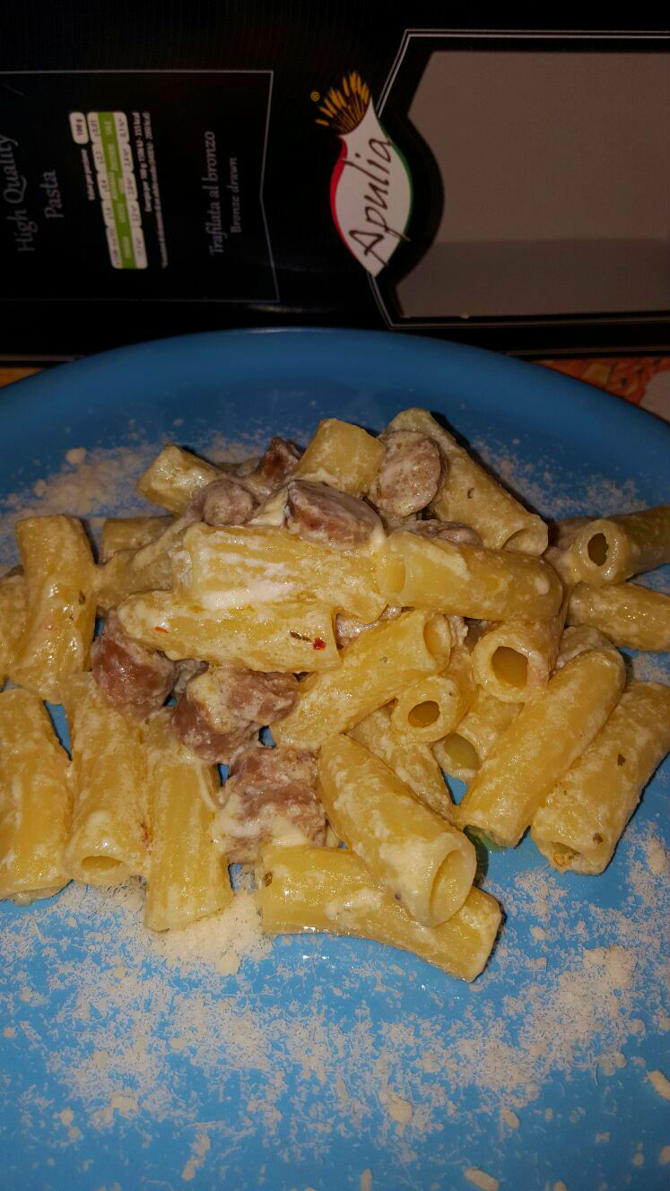 Scolare la pasta,rimetterla in pentola,unire la ricotta e subito l’olio caldo con le salsicce,