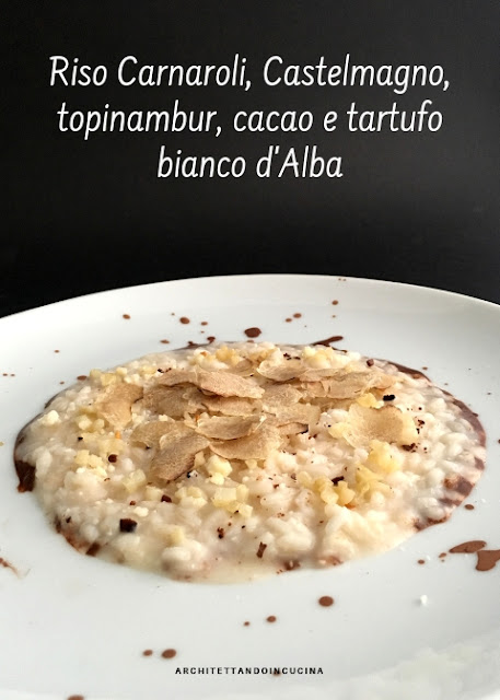 Riso Carnaroli, Castelmagno, topinambur, cacao e tartufo bianco d’Alba
