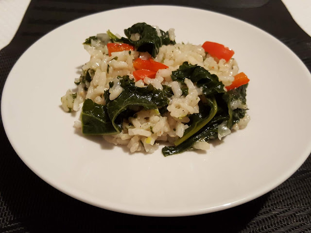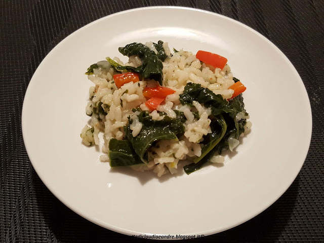 - Cuocere per un minuto, aggiungere il riso, tostare, unire il peperone, cuocere un minuto dopodiché aggiungere anche le foglie del cavolo riccio ed insaporire per due minuti.