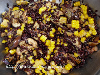 Cuocere il riso coperto d’acqua per 45 – 50 minuti, scolarlo e tenerlo da parte. Nel frattempo grigliare le melanzane a fettine sottili. Lessare le pannocchie per 15 minuti circa, tagliare gli spicchi di mais ed unirli alle melanzane ed al riso. Aggiungere un pizzico di sale ed un filo d’olio.