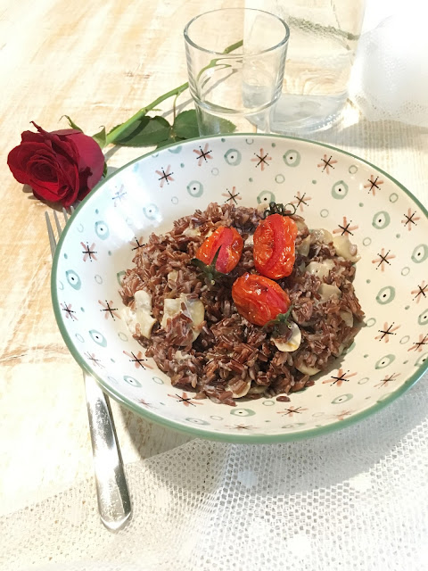 Il procedimento è semplicissimo, per prima cosa lavare i pomodorini e metterli in fono a 180°C conditi con sale, pepe, uno spicchio di aglio schiacciato e un filo d’olio finché non saranno appassiti. Ci vorranno circa 20-30 minuti. Eventualmente questi il potete preparare anche il giorno prima. Pulire e tagliare i funghi. Saltare questi ultimi a fuoco alto con uno spicchio di aglio e olio evo. A cottura terminata salare e pepare a piacere. Bollire il riso e mantecarlo poi con i funghi e la ricotta (o la panna di soia). Servire con i pomodorini al forno e del timo fresco.
