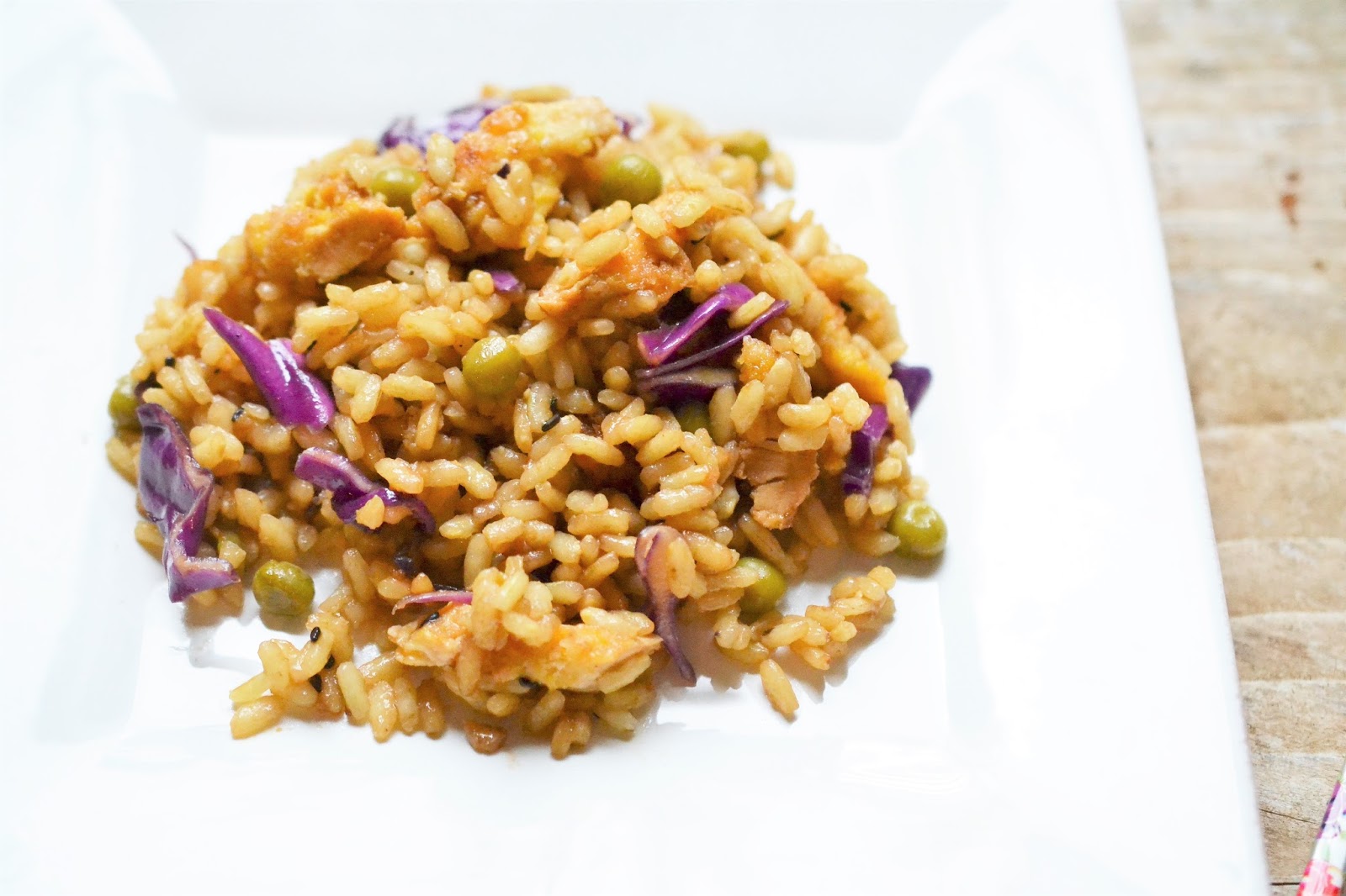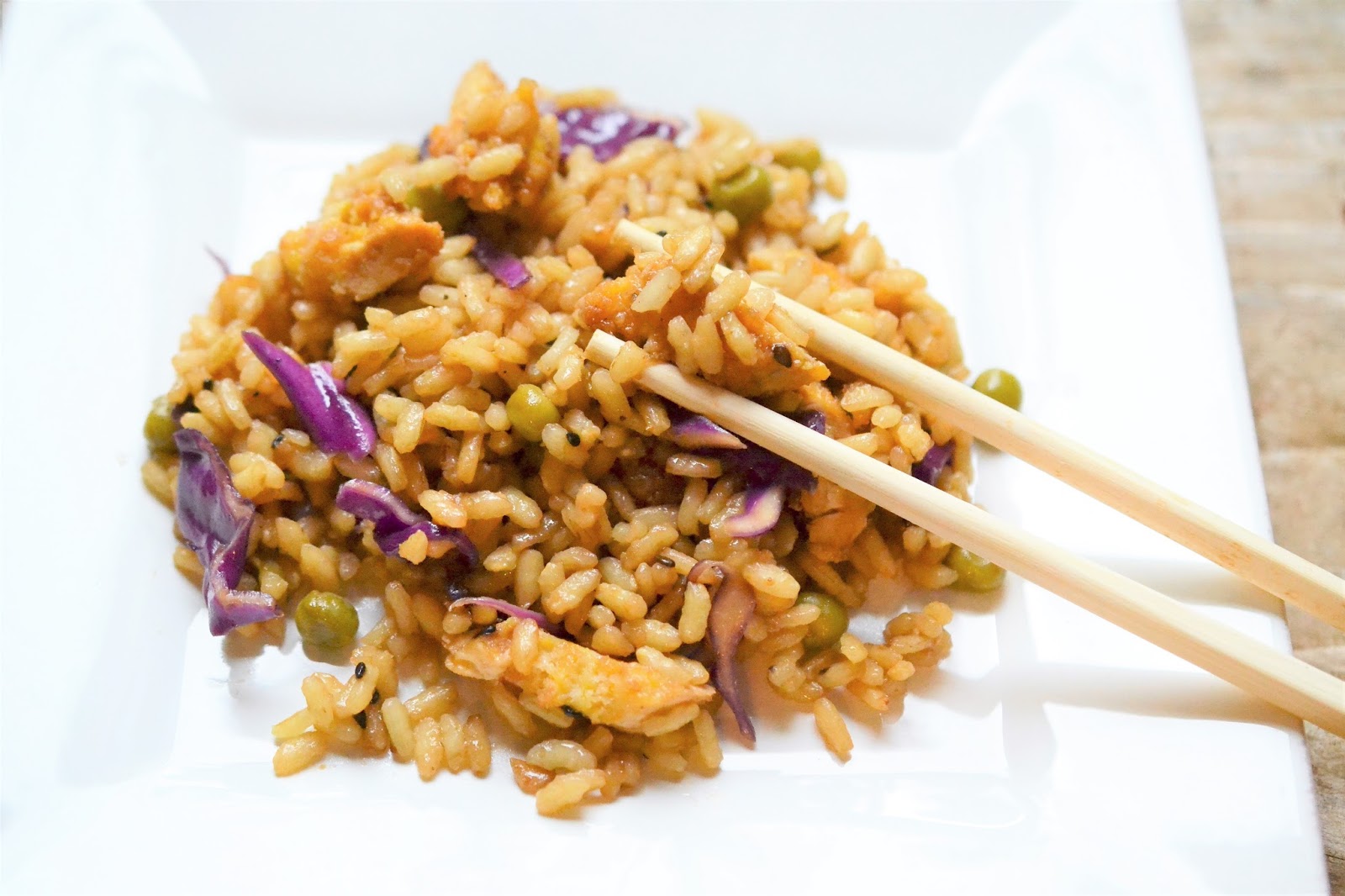 Questo riso è una delle mie espressioni meglio riuscite di riso stir fry con pollo impanato, piselli e cavolo..