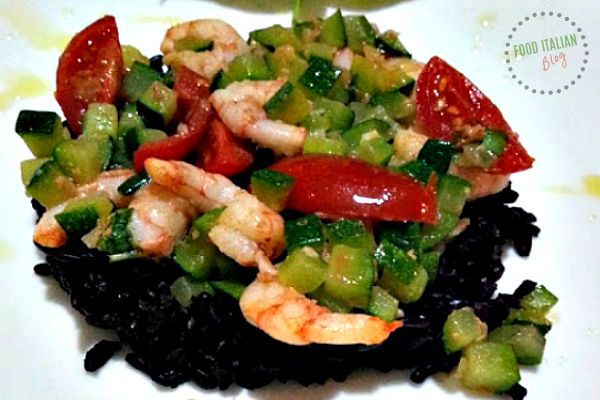Potete anche versare il riso ben scolato direttamente nella padella con le zucchine, unire i gamberi e i pomodorini, mescolare per fare amalgamare il tutto e servire.