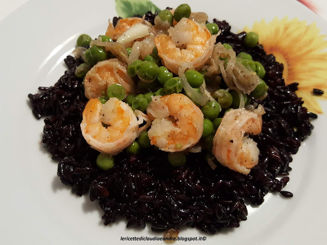 - A questo punto sarà pronto anche il riso, portare il tutto in tavola ed impiattare, accompagnando il riso con i gamberoni e i piselli.