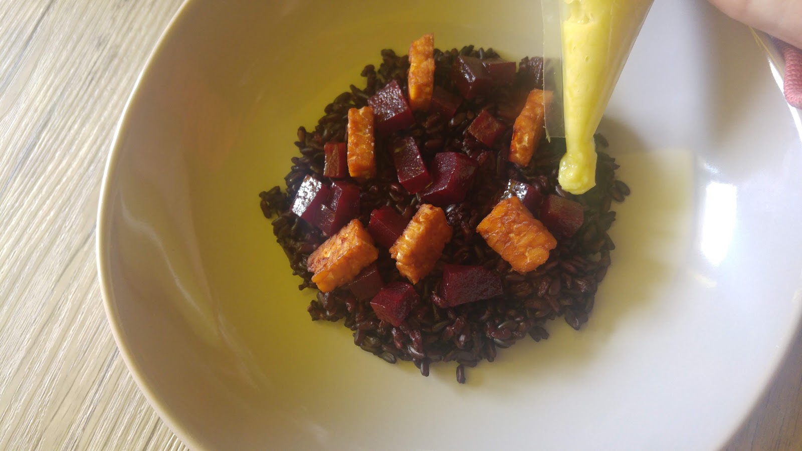 Una volta pronti tutti gli ingredienti andiamo a comporre il piatto: Il riso come base a cui ho aggiunto poco olio e non sale perchè la parte salata è data dalla preparazione che ho usato per il tempeh, distribuire i cubetti di barbabietola e tempeh, con l’aiuto di una sac’a a poche ho messo qua e la la crema di porro e completato con una chips di cavolo nero.