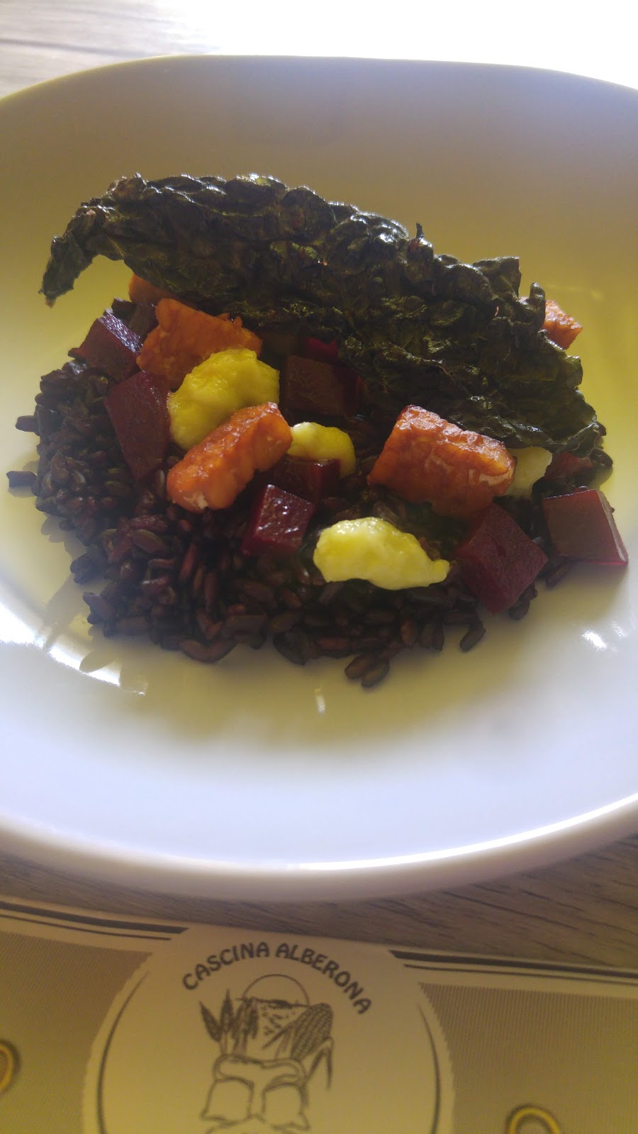 Inizio sempre di più ad adorare il riso nero, lo trovo molto versatile per le mie prove in cucina, oggi ho pensato di preparare un piatto #veggie riso venere nero di @cascinaalberona barbabietola , porro, tempeh e chips di cavolo nero. Il riso e il porro li ho cotti utilizzando la tecnica della vasocottura.