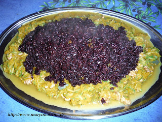 Lessare il riso venere per 40 minuti, eliminare l’acqua di cottura e tenerlo da parte. Affettare a fiammifero la zucca con tutta la buccia e le zucchine. Scottare le verdure in padella con un filo d’olio, un po’ di cipolla affettata finemente ed un po’ d’acqua. Aggiungere altra acqua dopo 5 -6 minuti, proseguire ancora per 5 minuti o più la cottura. Aggiungere sale, zafferano e noci, mescolare e versare su un vassoio. Aggiungervi il riso venere e portare in tavola.