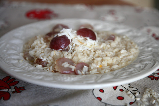 Far cuocere il risotto alla maniera tradizionale per 10 minuti, aggiungere l’uva e far cuocere per altri 5 minuti.