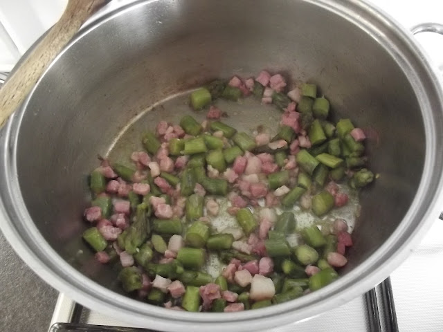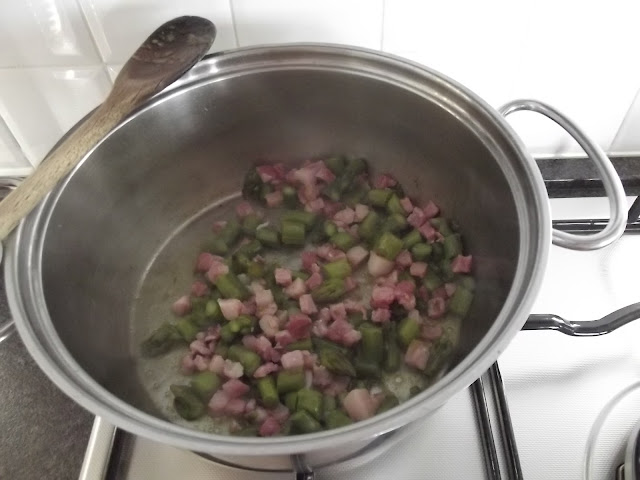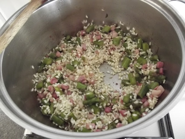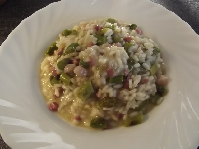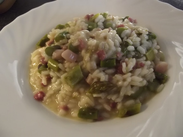 Quindi dovrete accontentarvi di un risotto di stagione, fatto con asparagi e pancetta affumicata.