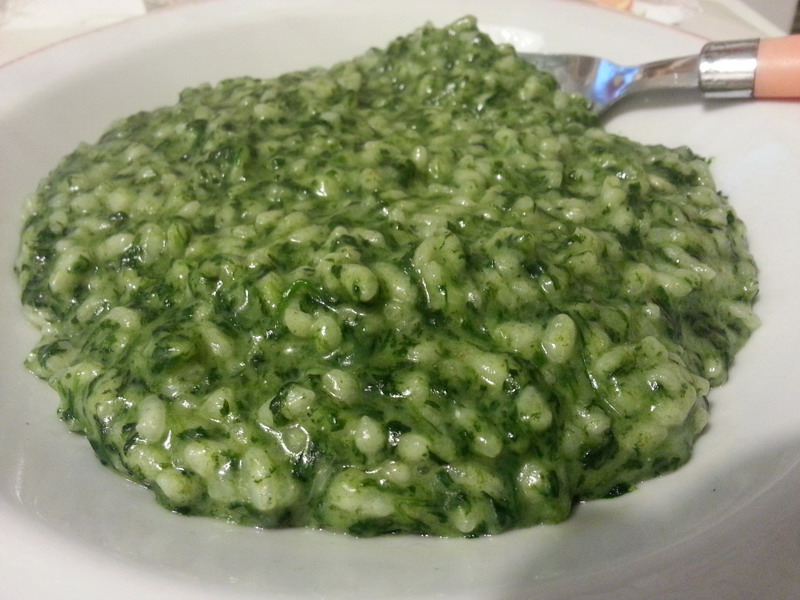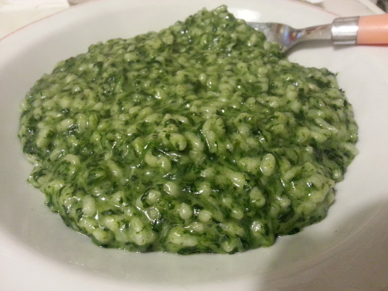 320 gr di riso Carnaroli o Arborio, circa 1 l di brodo, 400 gr di spinaci freschi, 200 gr di Taleggio, una piccola cipolla, olio, parmigiano, sale.