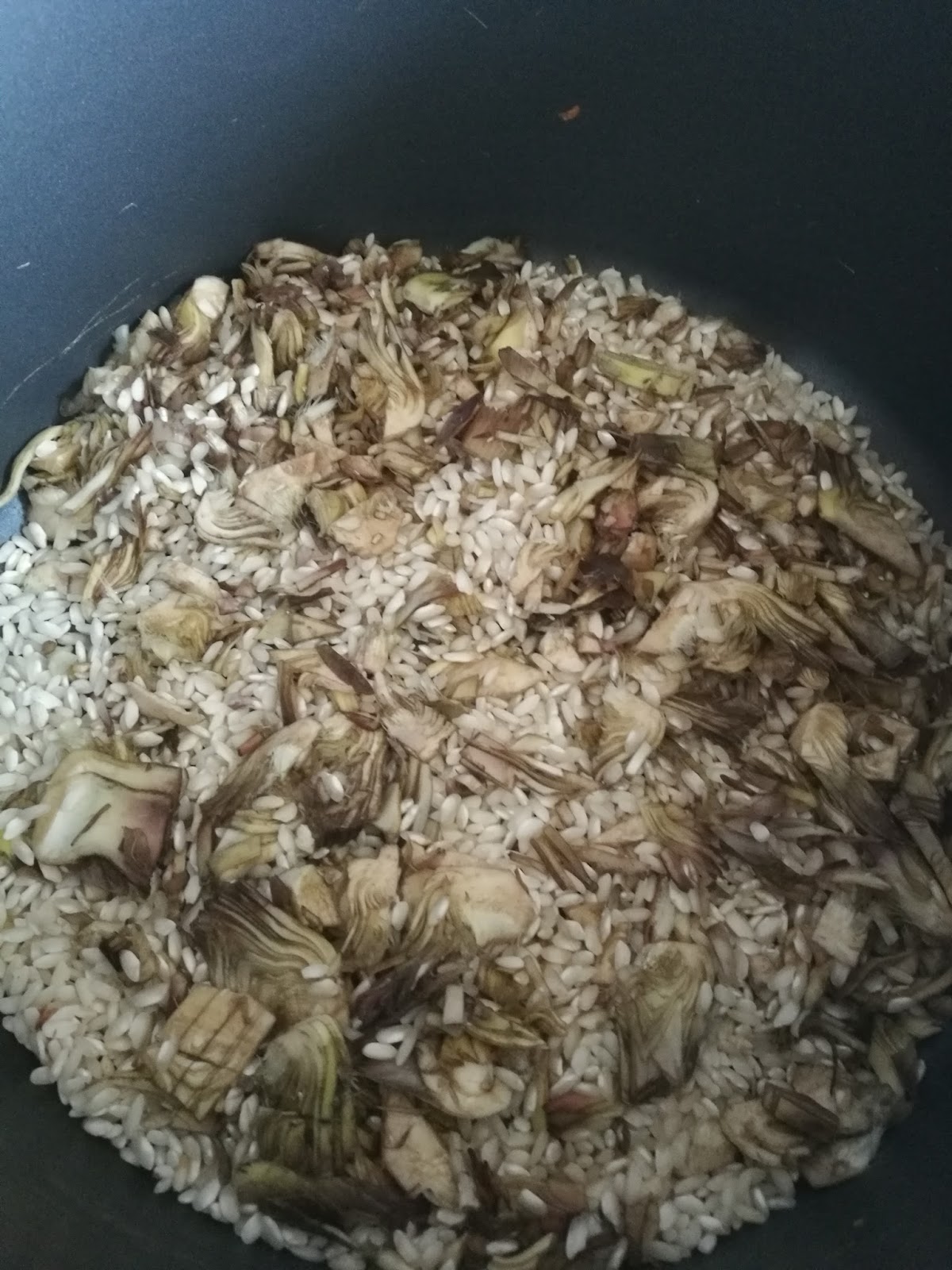 Preparare il risotto tostando il riso in padella per 1-2 min, aggiungere il resto dei carciofi tagliati finemente e dopo aver mescolato per un po, aggiungere il brodo un po per volta fino ad avvenuta cottura.