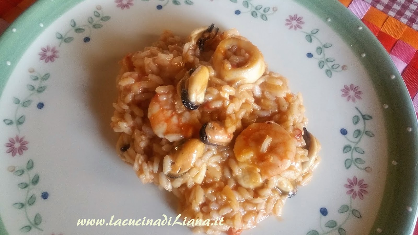 Soffriggere la cipolla con del peperoncino, se piace, e tostarvi il riso, quindi bagnare col del vino bianco, e quando sarà evaporato aggiungere del brodo di pesce, più il liquido di cottura delle cozze e portare a cottura il riso, aggiungendo brodo quanto basta. A metà cottura agiungere il concentrato di pomdoro o i pomodori a pezzi, e quando sarà al dente aggiungere i calamari coi gamberi, ed infine le cozze. Terminare con del prezzemolo tritato e una macinata di pepe o di peperoncino.