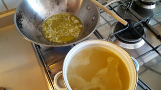Versare un fondo d’olio in una padella e far rosolare la cipolla, su un altro fornello ci sarà il brodo che dovrà restare sempre ben caldo.