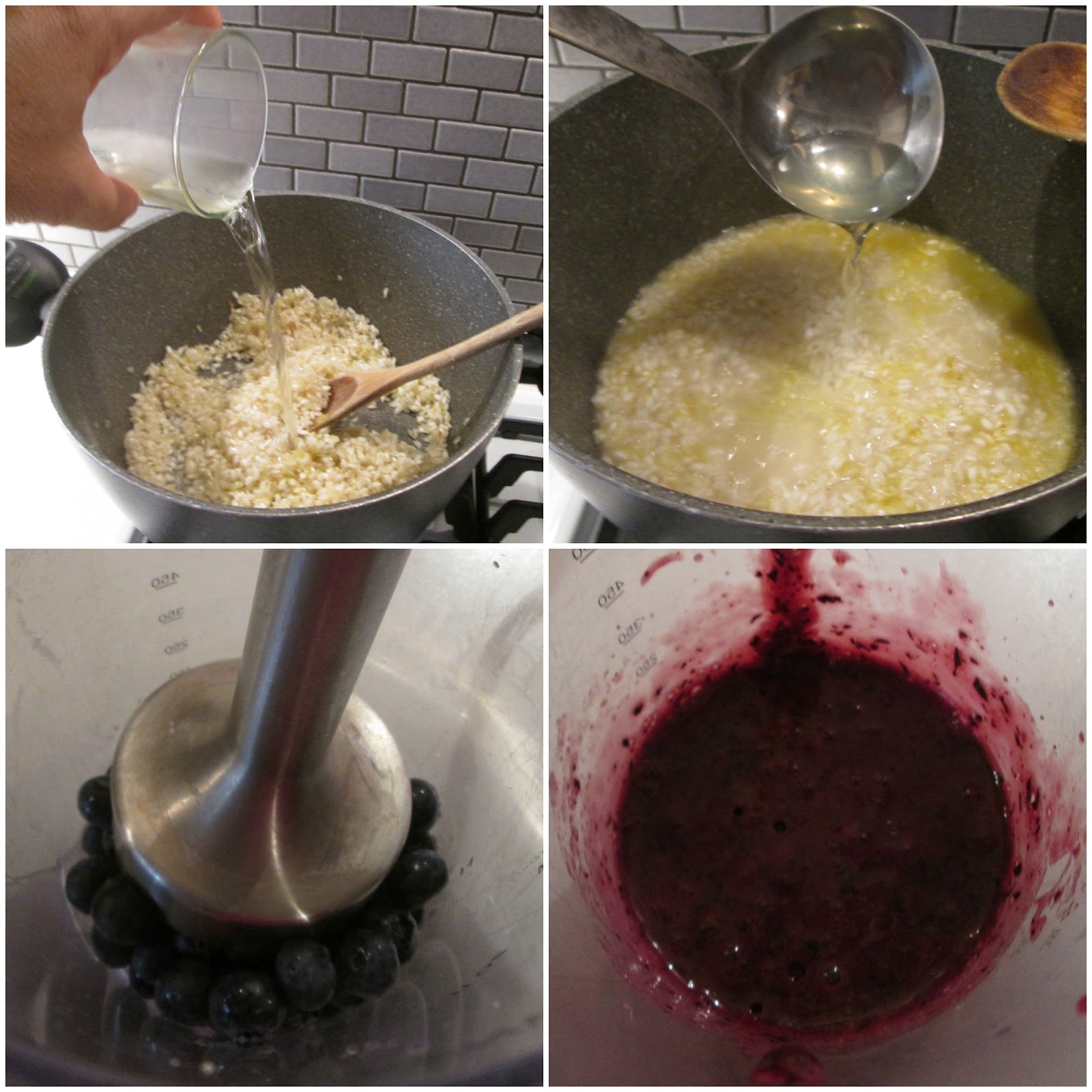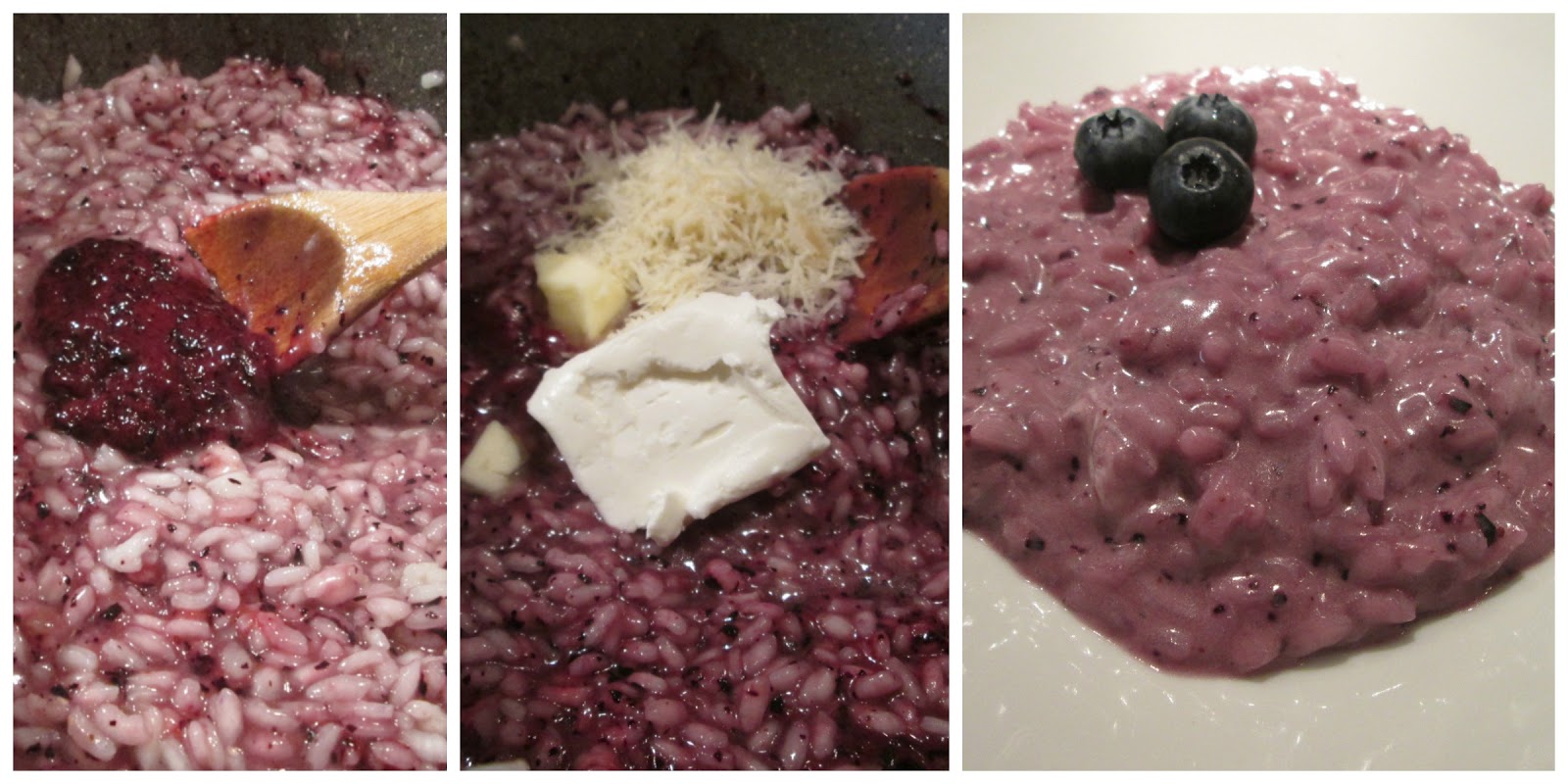 - terminata la cottura spegnete il fuoco, aggiungete i mirtilli frullati, girate e mantecate con il parmigiano grattugiato e la crescenza (mescolate per bene e coprite il risotto con un coperchio)