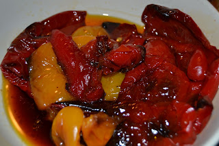 Sfornare i peperoni, farli raffreddare, poi pelarli: tenere il sugo di cottura dei peperoni.