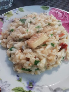 Per questo risotto ho schiacciato un po’ di baccalà ma ho anche tenuto dei pezzi di filetti interi come si vede nella foto . Ho fatto soffriggere lo scalogno ,aggiunto il riso e piano piano ho portato a cottura aggiungendo piano piano il brodo bollente ,a fine cottura ho aggiunto il baccalà.