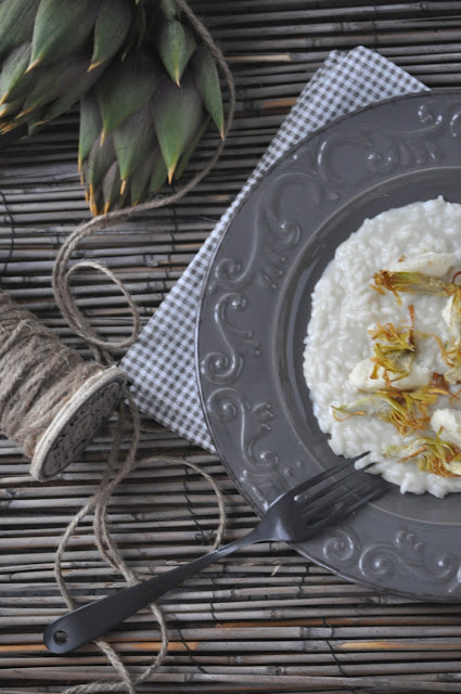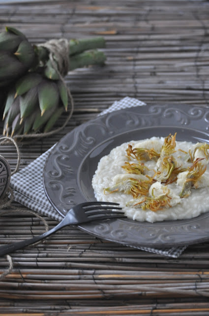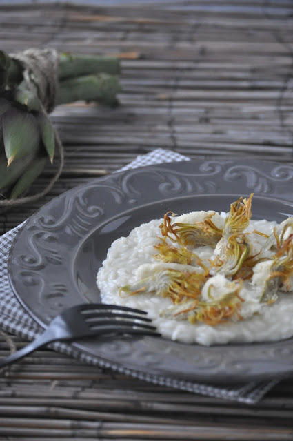 Il piatto di oggi è incredibile. Terra e mare si incontrano in un risotto super cremoso che ha lasciato i miei ospiti senza parole. A renderlo particolare, oltre a piccole quenelle di baccalà mantecato, sottilissime e croccantine chips di carciofi freschi fritti in abbondate olio.