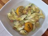 Pulite i carciofi, eliminando le spine esterne. Eliminate con un taglio netto le punte, e la barba centrale. Affettateli sottilmente. Versateli in una ciotola con acqua e limone per non farli annerire (foto 2). Portate a temperatura abbondante olio da frittura. Asciugate i carciofi per bene e friggeteli per pochi minuti. Scolateli e asciugateli su carta assorbente.
