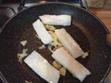 Per il baccalà mantecato: stufate in poco olio mezza cipolla tritata finemente. Unite eventualmente un goccio d’acqua per non farla colorire troppo. Aggiungete i tranci di baccalà bagnato e dissalato (foto 1). Cuocete per pochi minuti da entrambi i lati. Ricoprite con il latte, coprite con un coperchio, e proseguite la cottura per 15/20 minuti, fino a quando si sarà sfaldato. Trasferitelo in planetaria o in un mixer. Azionate a velocità bassissima la lama e unite a filo l’olio evo, come per una maionese, fino a quando otterrette una crema soffice e bianca. Regolate di sale e tenete da parte.
