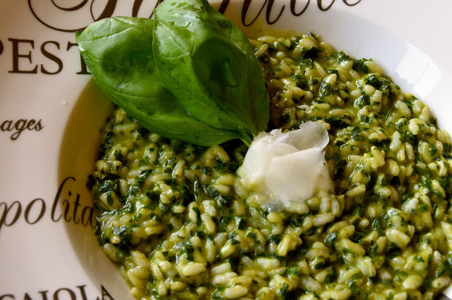 Mantechiamo il risotto con la salsa al basilico, eventualmente anche con qualche velo di Raspadura come ho fatto io, quindi amalgamiamo bene il tutto e serviamo con un ciuffo di basilico e una rosellina di Raspadura lodigiana.
