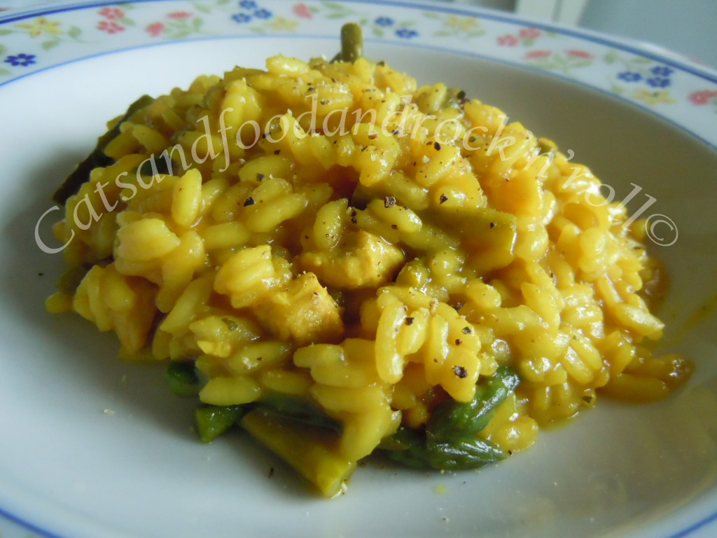 Poi però, accade che trafficando nel frigo, ti ritrovi tra le mani un involto con un pezzo di petto di pollo, ma giusto un frammento di circa 50 g, avanzato da qualcos’altro che avevi fatto e che, così da solo, non ci fai niente. Allora pensi “e se lo mettessi nel risotto? il petto di pollo ha un gusto abbastanza delicato, non dovrebbe sposarsi male con gli asparagi…”