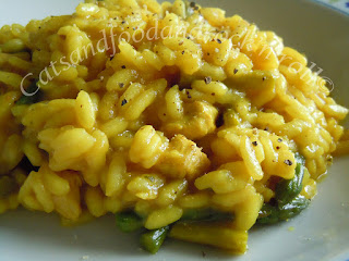 Poco prima della fine cottura, aggiungere la curcuma e le cime degli asparagi.
