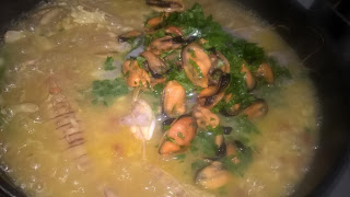 Trascorsi 10 minuti, aggiungo i gamberetti sgusciati e le cozze e, prima di togliere dal fuoco, del prezzemolo fresco.
