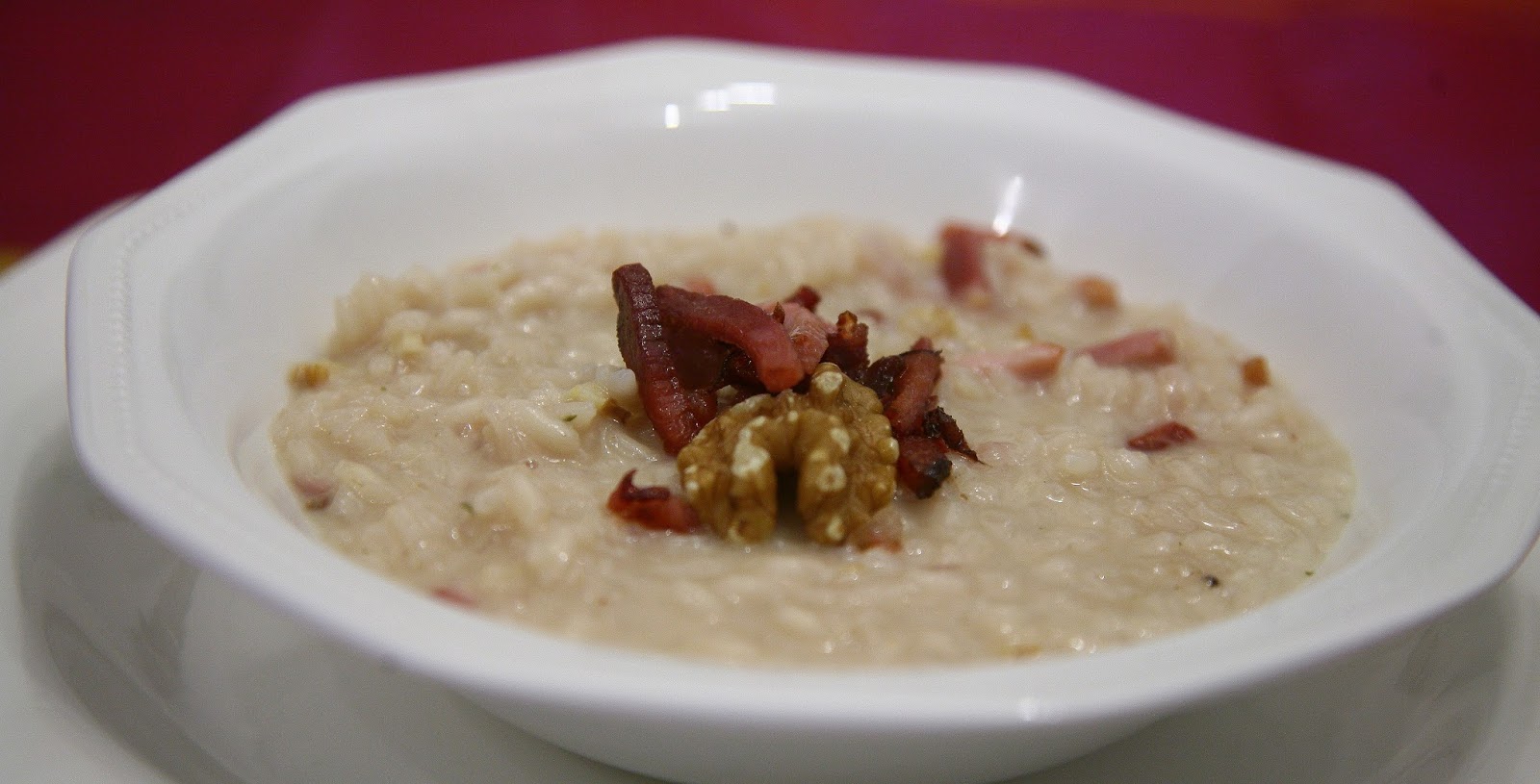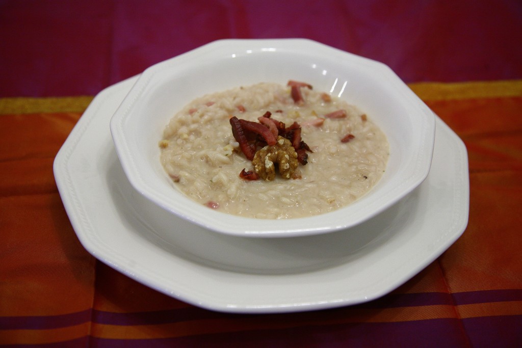 Lasciare riposare il risotto altri 2 minuti nella pentola prima di impiattare aggiungendo lo speck croccante e mezzo gheriglio di noce.