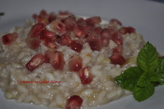 Un paio di minuti prima che la cottura sia ultimata aggiungo il succo di melagrana. Faccio mantecare con il parmigiano e servo decorando con i chicchi di melagrana.