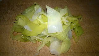 Utilizzo il porro sbollentato perchè mi piace un gusto più delicato che non prevarichi la melagrana. Tagliuzzo con un coltello, finemente.