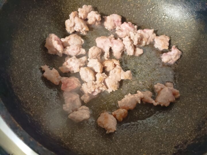 Spellare e sgranare con le mani o una forchetta la luganega e metterla a rosolare in una padella.