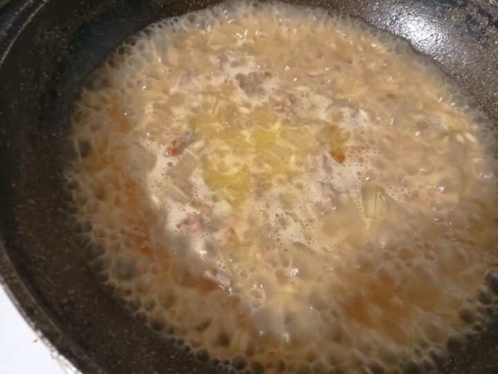 Aggiungere il brodo caldo poco alla volta, mescolando spesso, per circa 15–18 minuti.
