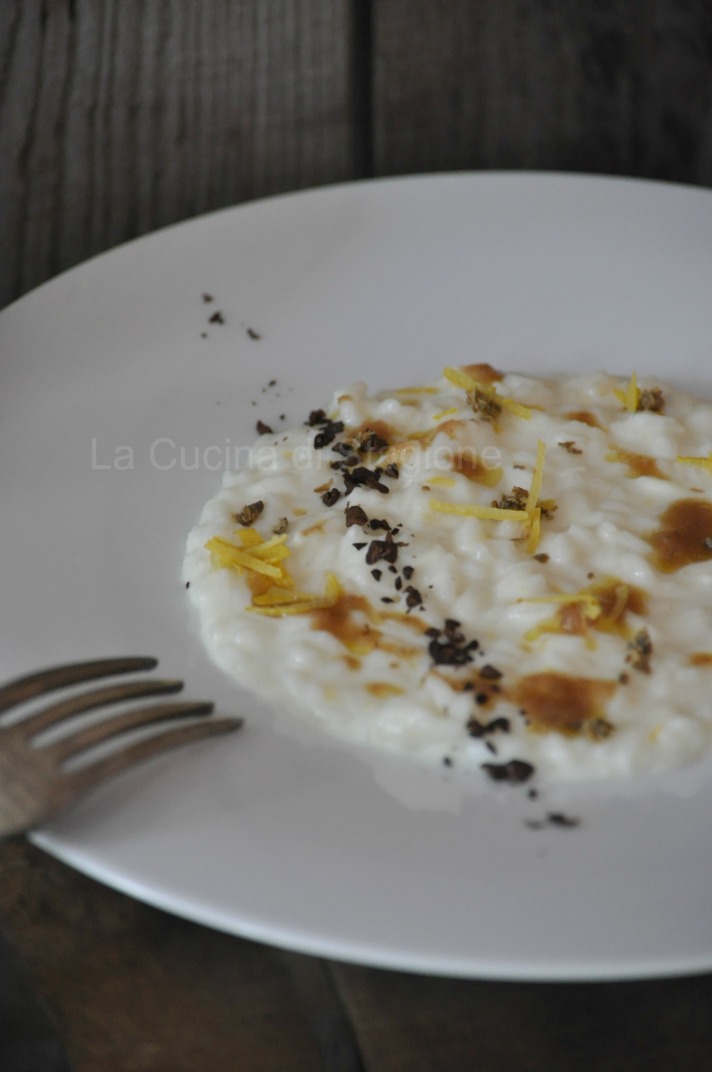 Tostate il riso a secco, sfumatelo con il vino bianco. Portatelo a cottura unendo poco alla volta il brodo vegetale bollente. Mantecate con il formaggio grattugiato, la robiola, qualche cubetto di burro e le bucce di limoni grattugiate. Servite il risotto con gocce di salsa alle acciughe, capperi, julienne di limoni e polvere di caffè (foto 3).