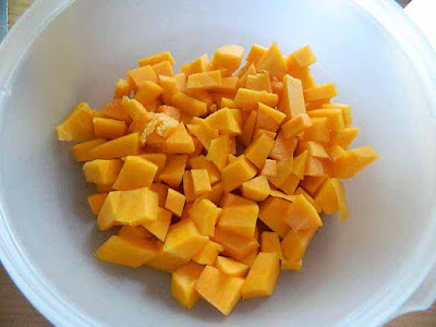 Per prima cosa preparare il brodo vegetale facendo bollire carota, cipolla, patata, sedano, oppure più velocemente sciogliere un dado di brodo vegetale in acqua bollente. Pulire la zucca liberandola dai semi e dalla buccia,