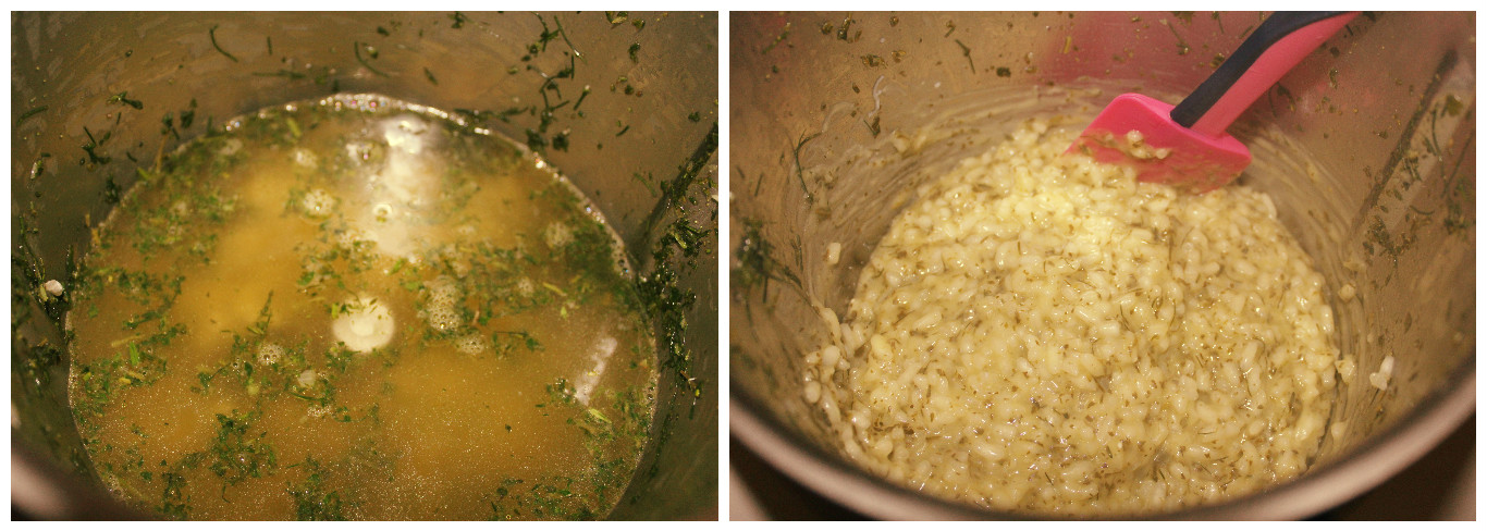 Aggiungete il brodo che deve essere a temperatura ambiente o tiepido, e completate la cottura del riso 15 minuti,velocità 1, lame movimento inverso, 100°. L’ultimo minuto aggiungete il grana e il burro rimasto per mantecare il risotto; una volta terminato il tempo, mescolate ancora con la spatola e servite subito ben caldo.