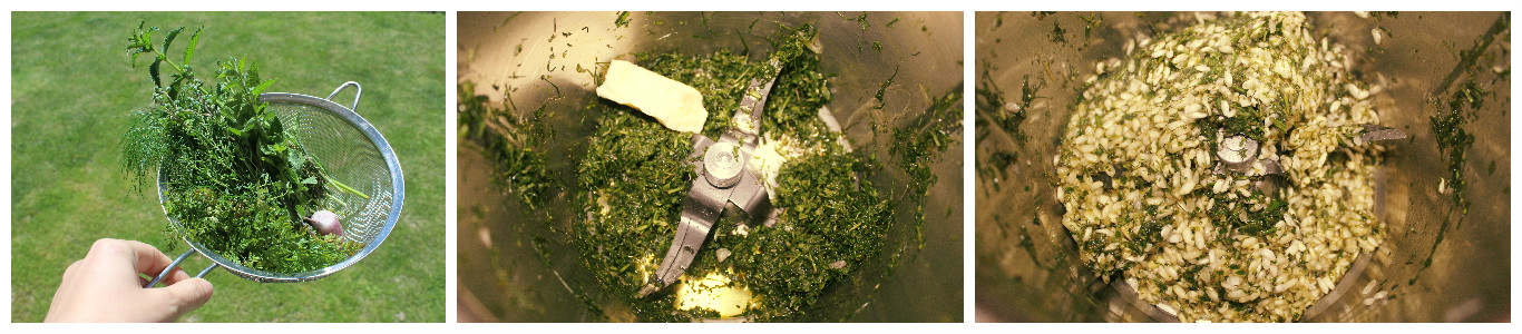 Lavate le erbe asciugatele con carta da cucina, staccate le foglie dai loro rametti ed inseritele nel boccale del bimby insieme allo scalogno sbucciato; tritate tutto per 20 secondi a velocità 6, raccogliete dai bordi del boccale con una spatola il trito, e aggiungete 20 g di burro; cuocete 3 minuti a 100° velocità 1.