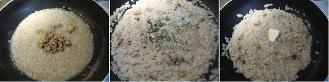 Appena il nostro risotto sarà cotto, spegniamo il fuoco ed aggiungiamo le vongole sgusciate avendo cura di tenerne qualcuna da parte col guscio per la decorazione finale. Amalgamiamo quindi aggiungiamo il timo ed aggiustiamo di sale e pepe. Mantechiamo adesso col burro e con olio a filo fino a quando il nostro risotto non avrà una consistenza cremosa.