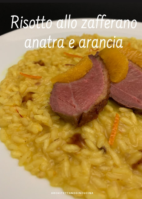MTC S-COOL argomento risotto. A questo giro, avevo troppe idee che mi frullavano per la testa, ma poi mi sono concentrata su questa che aveva però qualche criticità. Ho pensato al risotto alla milanese che si serve di solito con l’osso buco appoggiato sopra. Se fatti bene, sia il risotto che l’ossobuco, il piatto risulta molto ben legato dal midollo nel risotto. Nel mio caso ho fatto un brodo con la carcassa dell’anatra (regalatami dal macellaio) in modo che il risotto avesse già un lieve sentore d’anatra, poi ho poggiato sopra la carne rosa che avevo prima passato sulla salsa per farle assorbire i sapori. Alcuni puntini di salsa sul riso, hanno completato il legame tra le 2 preparazioni. Nel complesso, un piatto facile da fare e la cottura in padella e poi in forno, dell’anatra ha risolto i problemi, dati dai diversi tempi di cottura. I sapori sono ben amalgamati e la nota acidula dell’arancia fresca, sgrassa la mantecatura del riso. La salsa all’arancia, profuma ed insaporisce sia il riso che la carne. Le scorzette danno una lieve nota di croccantezza.