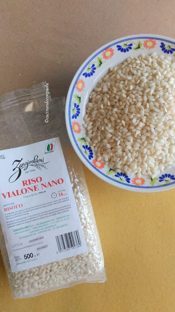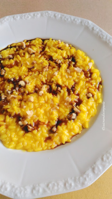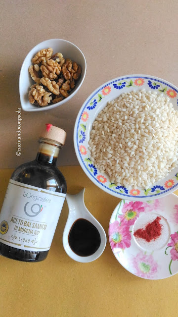 Servite il risotto con la granella di noci e un bel cucchiaio di aceto balsamico di Modena.