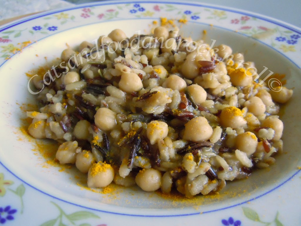 Come, in questo caso, col riso. Ho in dispensa questo mix di vari risi, che in combinazione coi ceci che, come si sa, sono molto impiegati anche nella cucina nordafricana e mediorientale, mi hanno permesso di ottenere una minestra che è una sorta di punto d’incontro tra un nostro risotto e un piatto etnico.