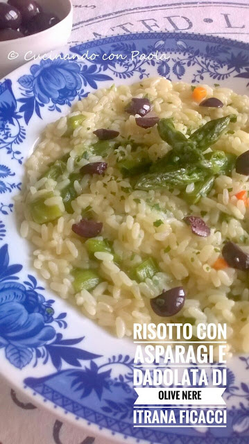 In un pentolino scaldate un po’ d’olio e cuocete le punte degli asparagi, aggiungete qualche cucchiaio di brodo e cuocete per alcuni minuti, devono rimanere croccanti. Servite il risotto molto caldo, decorate con le punte degli asparagi e le olive nere Itrana tagliate a pezzettini.